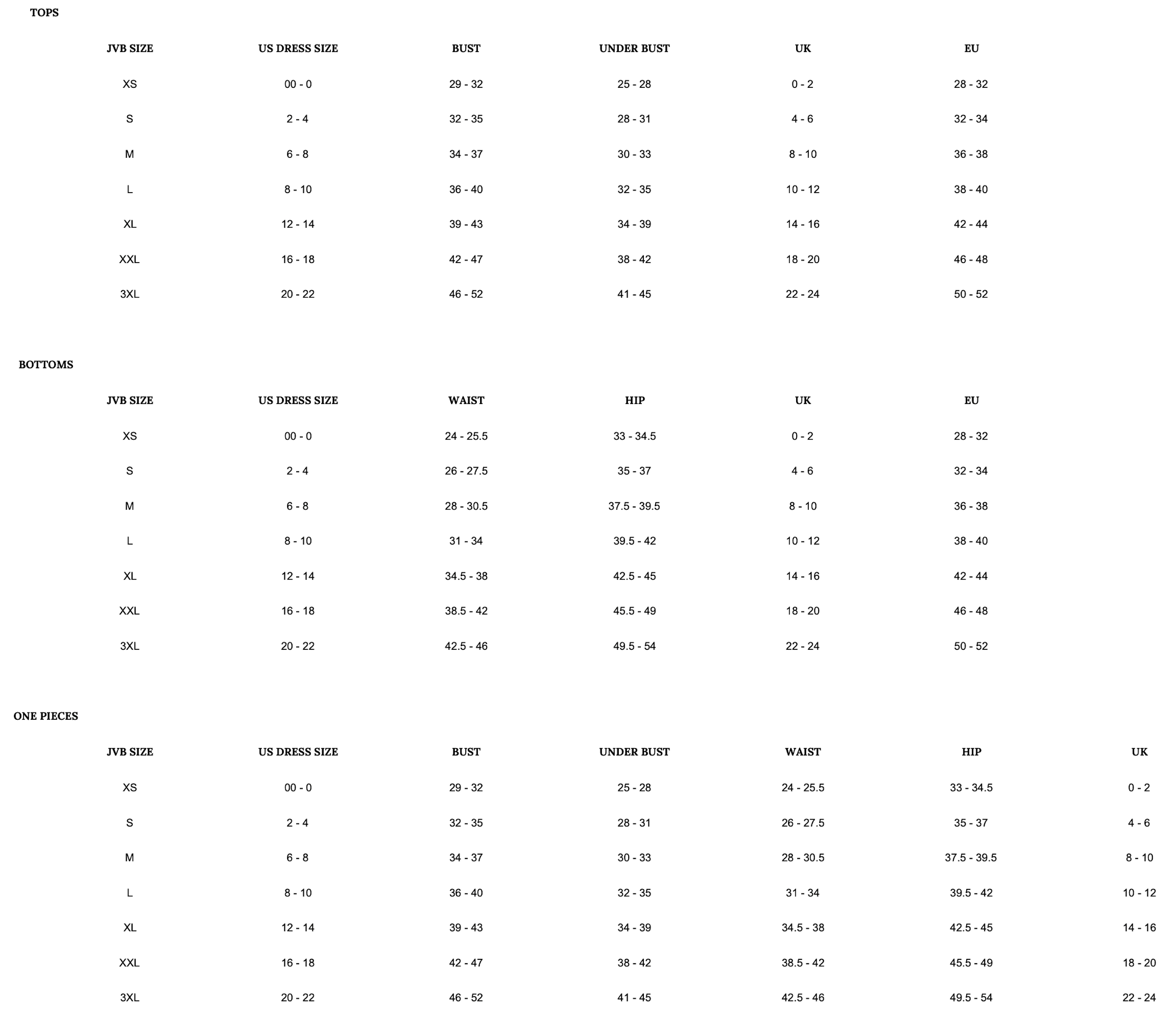 Bodies are all different; you can be the same size as someone, and based on your body type, muscular or soft, real or augmented breasts, the fabric can react differently. JVB Swim does our best to be inclusive and accurate in sizing using dead stock fabrics. If you have questions about sizing, or your best fit - please email info@jillianvonbeyer.com .